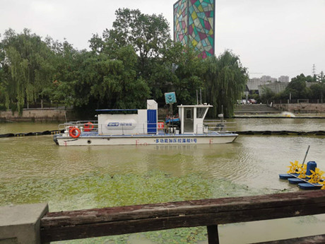 公司研發(fā)的加壓控藻船,以玻璃鋼船體為平臺,配置藍藻打撈、壓力控藻和曝氣裝置...